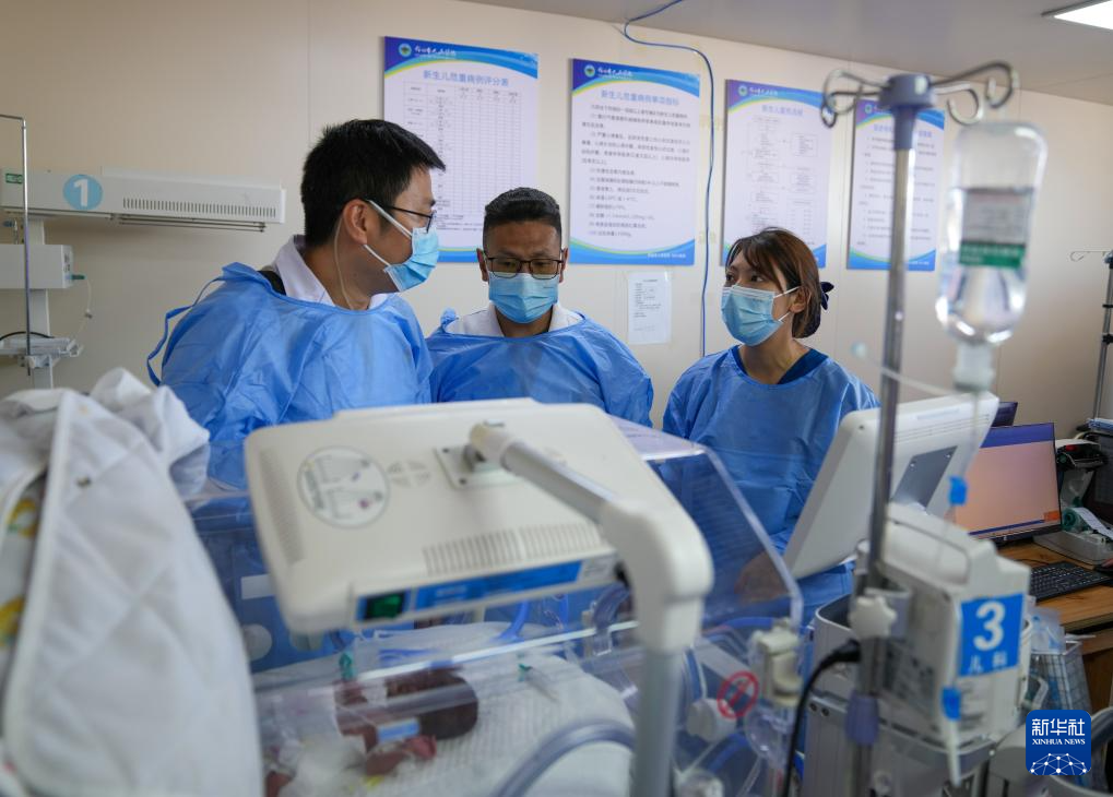 在那曲市人民醫(yī)院新生兒重癥監(jiān)護(hù)室,來(lái)自大連醫(yī)科大學(xué)附屬第一醫(yī)院的援藏醫(yī)生田聰亮(左)與吉美多布杰(中)、護(hù)士旦珍合作,為一名早產(chǎn)兒實(shí)施機(jī)械通氣治療(7月18日攝)。吉美多布杰2003年從四川大學(xué)華西醫(yī)學(xué)院畢業(yè)來(lái)到那曲市人民醫(yī)院工作,他先后和8批援藏專(zhuān)家合作、學(xué)習(xí)。新華社記者 晉美多吉 攝 ??