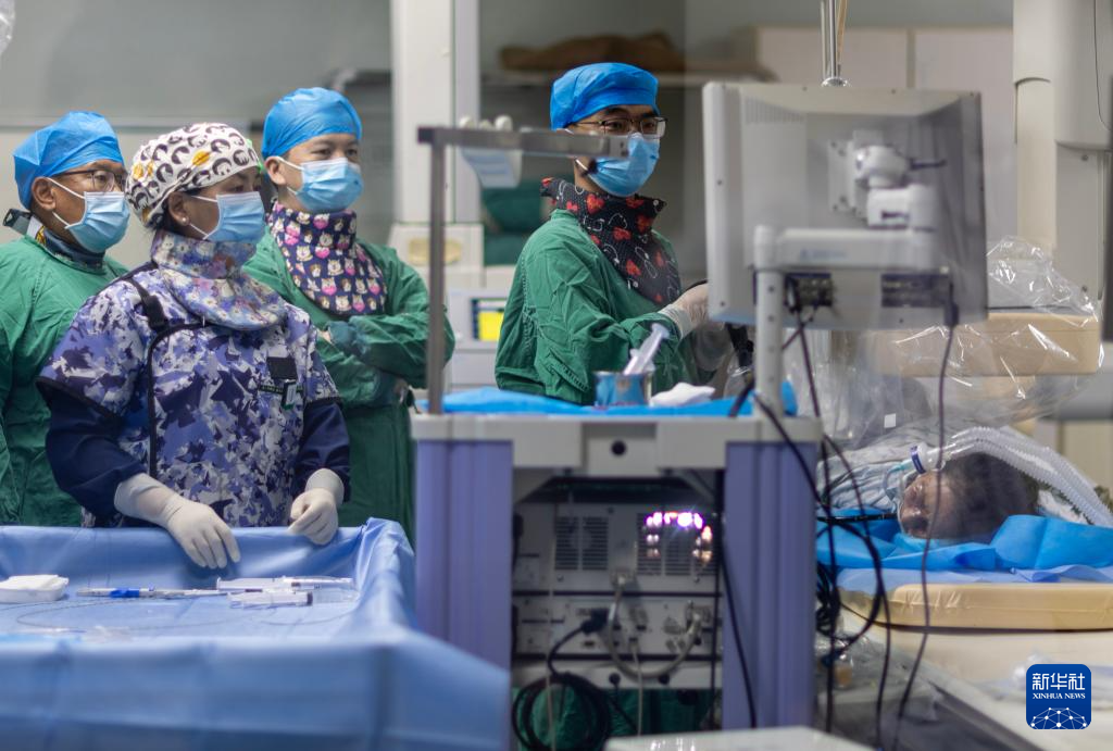 ?協(xié)和醫(yī)院第十批援藏醫(yī)生王強(qiáng)(左四)、第十一批援藏醫(yī)生蔣青偉(左三)和西藏自治區(qū)人民醫(yī)院醫(yī)生扎西(左一)在拉薩為患者施行內(nèi)鏡逆行胰膽管造影術(shù)(8月5日攝)。新華社記者 姜帆 攝 ??