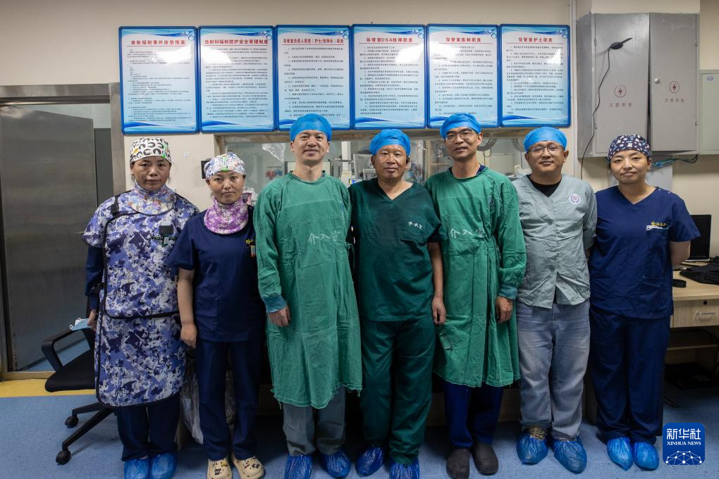 協(xié)和醫(yī)院第十批援藏醫(yī)生王強(qiáng)(右三)、第十一批援藏醫(yī)生蔣青偉(左三)和西藏自治區(qū)人民醫(yī)院醫(yī)生扎西(中)、旦增索朗(右二)及手術(shù)團(tuán)隊(duì),在拉薩為患者施行內(nèi)鏡逆行胰膽管造影術(shù)后合影(8月5日攝)。新華社記者 姜帆 攝 ??