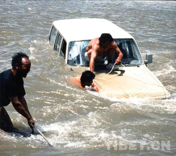 圖為1994年,李永憲(中)、丹扎(左)、旺堆次仁在拯救翻進(jìn)河水中的考古隊(duì)的車