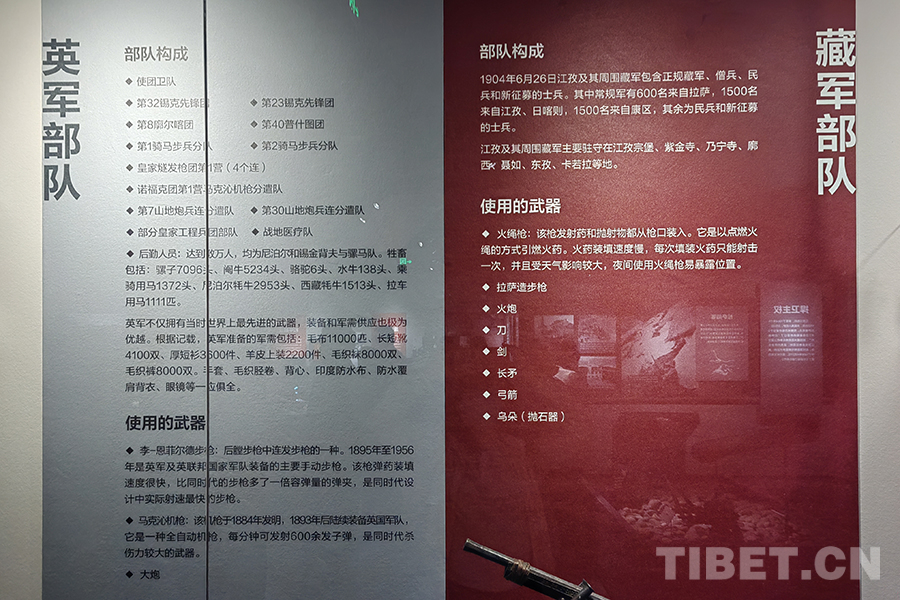 圖為宗山號角——紀(jì)念西藏江孜抗英保衛(wèi)戰(zhàn)120周年主題展,對比英帝國主義侵略者與當(dāng)時江孜守軍軍力情況的展板 攝影:楊月云