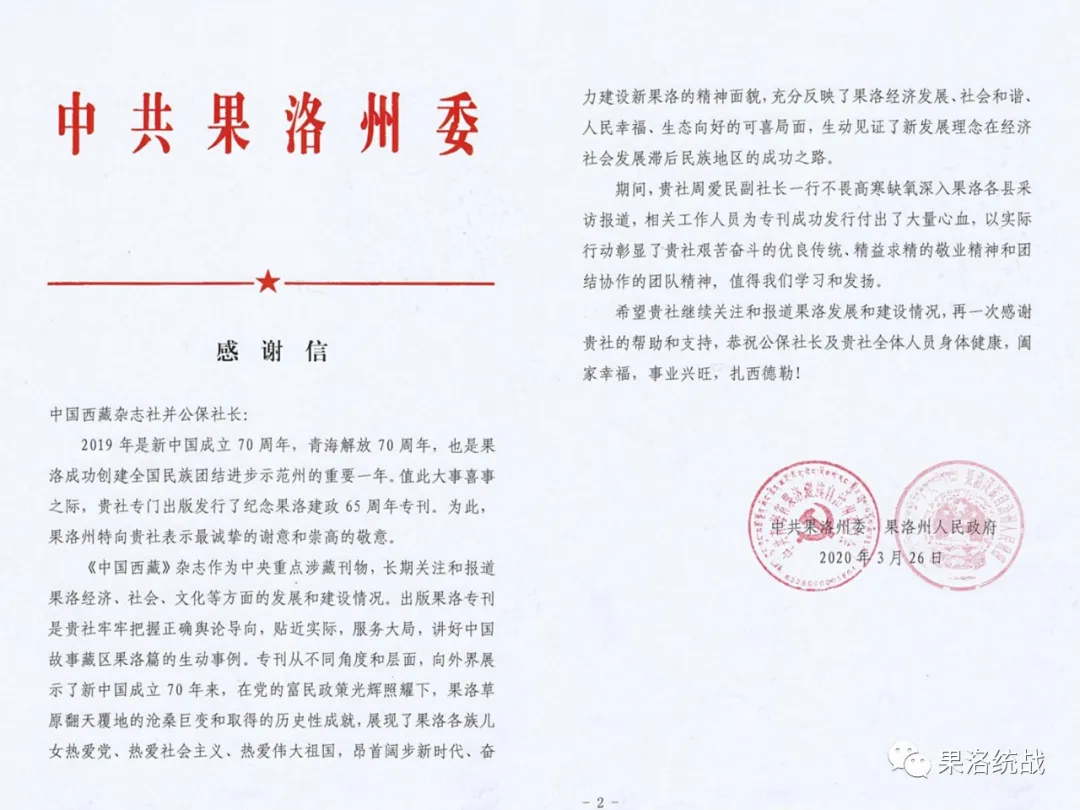 中國(guó)西藏網(wǎng)訊 3月26日,中共果洛州委、州人民政府致信中國(guó)西藏信息中心,對(duì)中國(guó)西藏信息中心推出果洛藏族自治州建政65年《中國(guó)西藏》雜志??硎靖兄x。