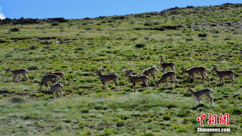 9月2日,多只藏原羚和巖羊在西藏山南羊卓雍錯湖畔覓食。當(dāng)?shù)亟陙聿粩嗉哟蟊Wo(hù)力度,環(huán)境日益趨好,野生動物種群正在逐漸恢復(fù)、增長。中新社記者 江飛波 攝