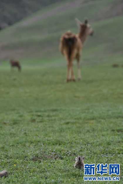 保護區(qū)內(nèi)馬鹿和兔鼠和諧相處(6月24日攝)。新華網(wǎng) 張宸 攝