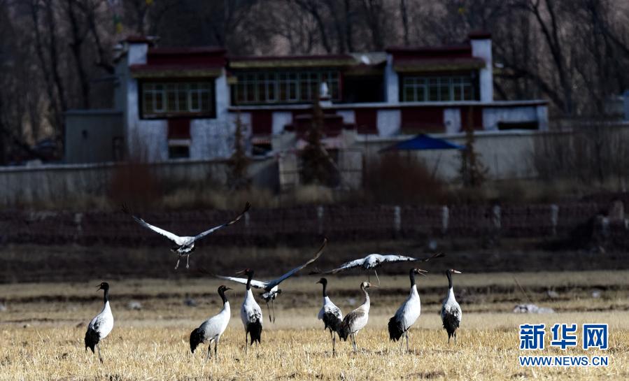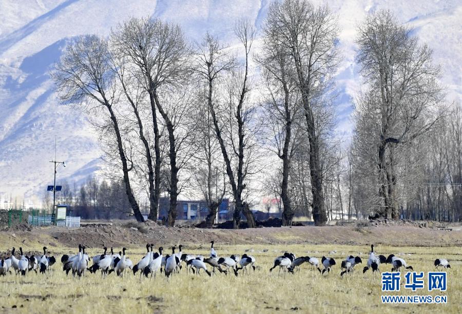 這是12月12日在林周縣黑頸鶴自然保護(hù)區(qū)卡孜鄉(xiāng)拍攝的黑頸鶴。新華社記者 黃豁 攝