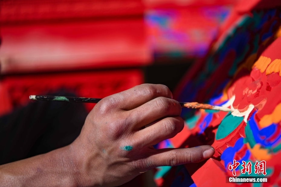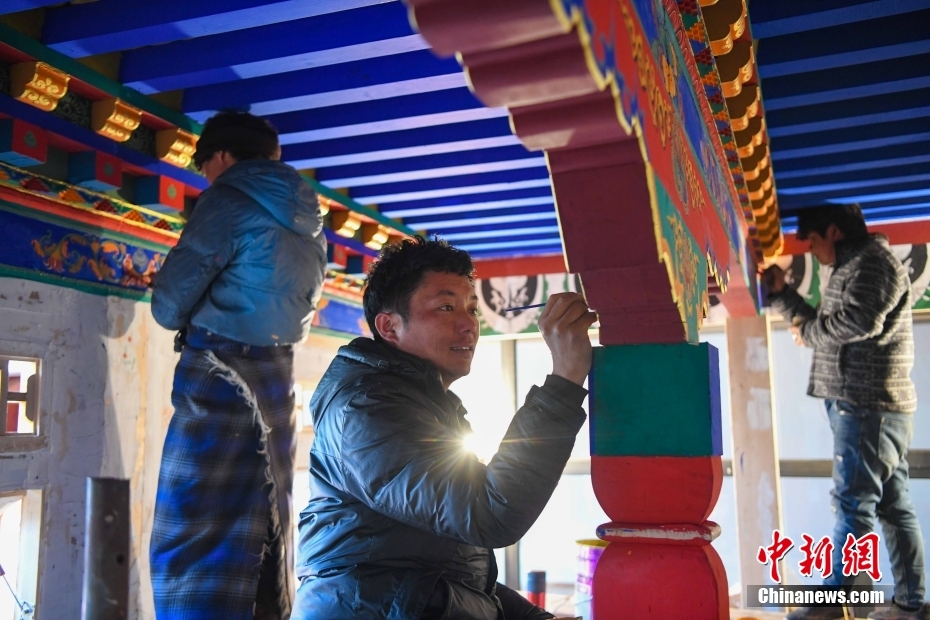 12月28日,西藏拉薩堆龍德慶區(qū),古俗民族傳統(tǒng)手工藝發(fā)展專業(yè)合作社員工在房屋上繪制藏式裝飾。據(jù)悉,該合作社以繪畫、木工、縫紉為主,承接傳統(tǒng)手工藝方式制作家具、房子裝修、唐卡繪畫、旅游產(chǎn)品、文物建筑維修等工作。自2018年合作社成立至今,帶動就業(yè)共60余人。 中新社記者 貢嘎來松 攝