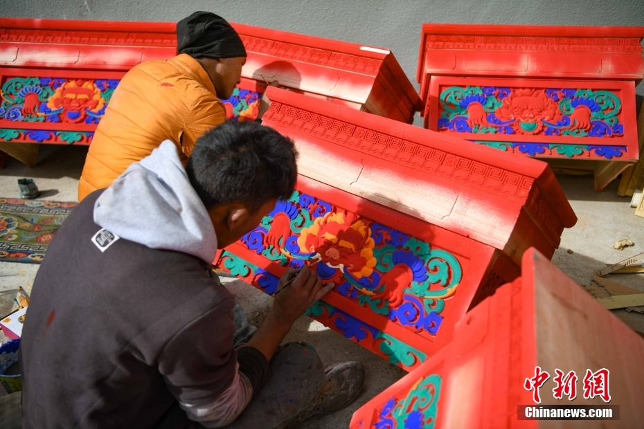 12月28日,西藏拉薩堆龍德慶區(qū),古俗民族傳統(tǒng)手工藝發(fā)展專業(yè)合作社員工在家具上繪制藏式裝飾。中新社記者 貢嘎來松 攝