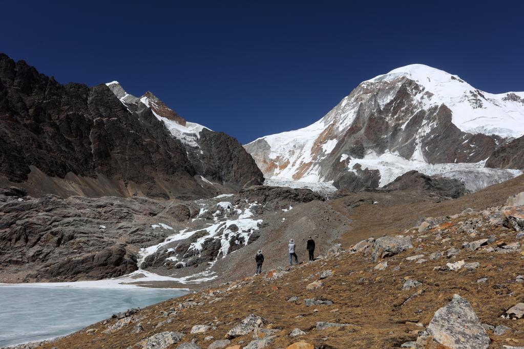 2022年3月27日,幾位探險(xiǎn)者在遠(yuǎn)眺窮母崗日峰腳下的冰川。(新華社記者 姜帆 攝)