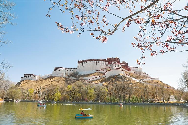 經(jīng)過春意潤染的城市,處處呈現(xiàn)出純凈明朗的美。布達(dá)拉宮的金頂反射著耀眼的金光,布達(dá)拉宮廣場前綠草茵茵,人工湖旁的垂柳被和煦的春風(fēng)吹得飄飄揚揚,羅布林卡里的古樹也開始抽出鮮嫩的枝葉,繁華的八廓街上,三五成群的轉(zhuǎn)經(jīng)老人坐在路邊歇息……