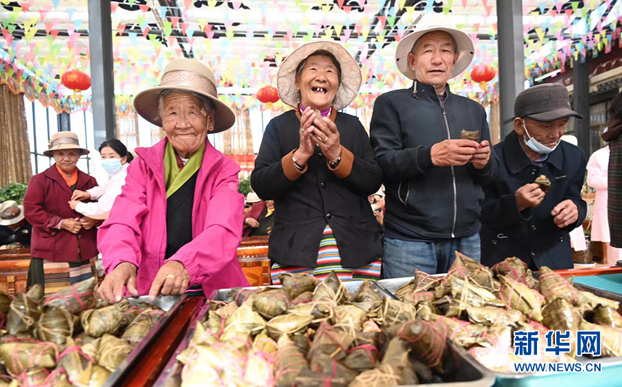 6月3日,在西藏山南市集中供養(yǎng)服務(wù)中心,老人們品嘗美味的粽子。新華網(wǎng)發(fā)(許國 攝)