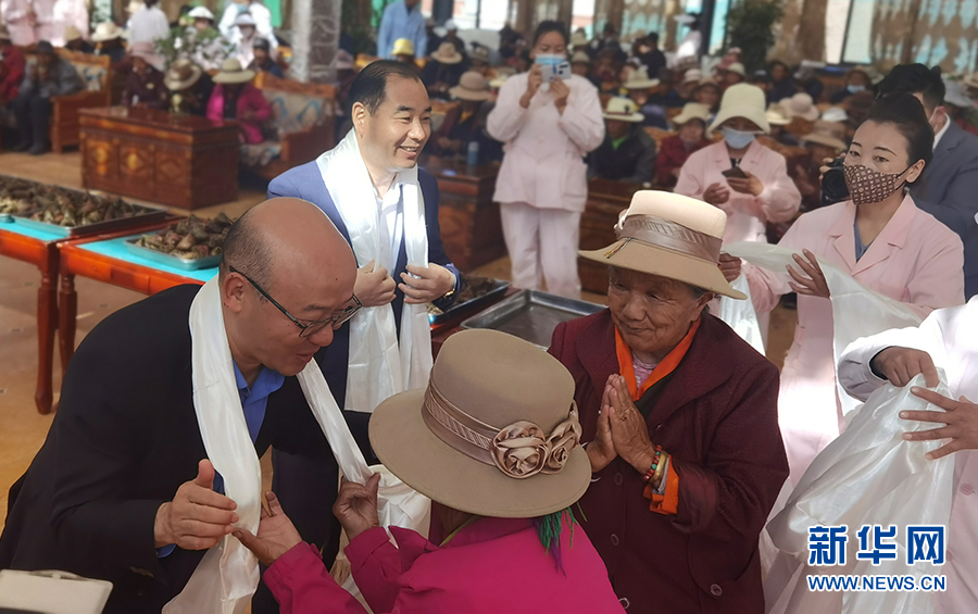 6月3日,西藏山南市集中供養(yǎng)服務(wù)中心內(nèi),老人向安徽第七批援藏工作隊的隊員獻上潔白的哈達。新華網(wǎng) 王雷 攝