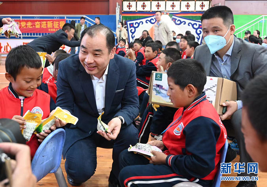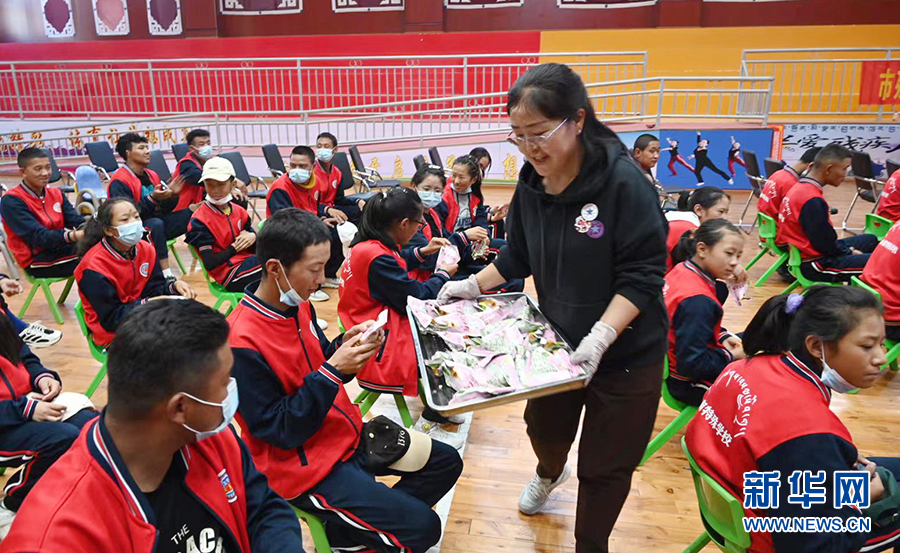 6月3日,在西藏山南市特教學校,安徽岸香集團董事長黃保鎖為孩子們分發(fā)粽子。新華網(wǎng)發(fā)(許國 攝)