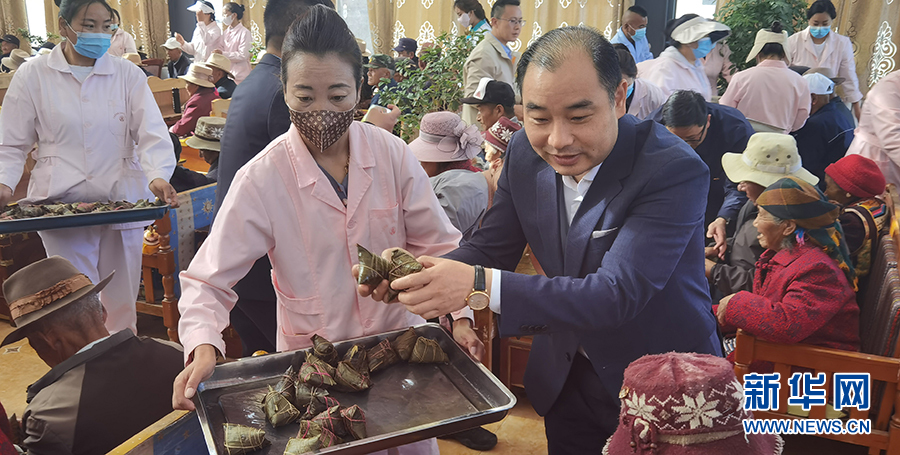 6月3日,在西藏山南市集中供養(yǎng)服務(wù)中心,安徽第七批援藏工作隊隊長汪華東為孤寡老人送上粽子。新華網(wǎng) 王雷 攝