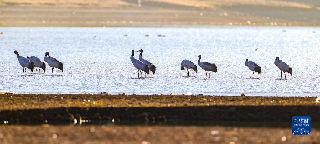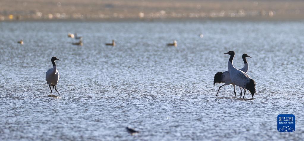 在林周縣虎頭山水庫拍攝的黑頸鶴(11月6日攝)。新華社記者 姜帆 攝