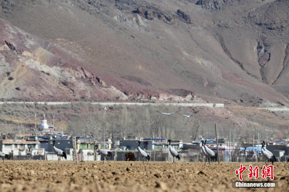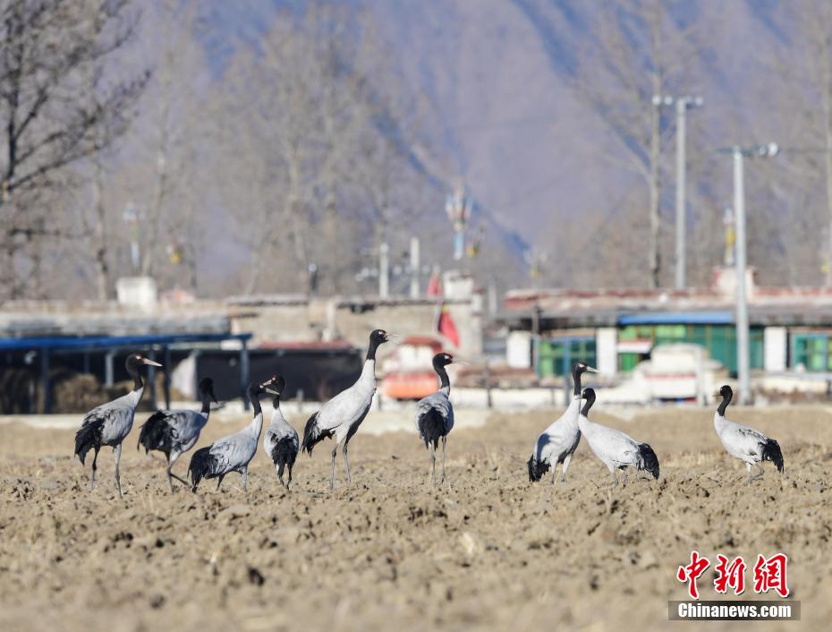 每年的10月底,成群的黑頸鶴飛到西藏拉薩市林周縣越冬,在拉薩市林周縣周邊的湖泊濕地度過(guò)5個(gè)月的“閑云野鶴”生活,次年三四月份再飛向藏北草原繁殖。黑頸鶴是世界上唯一一種高原鶴類。具有足長(zhǎng)、喙長(zhǎng)、頸長(zhǎng)的典型涉禽類特征,適合在沼澤地里行走。黑頸鶴的頸、尾為黑色,體羽為灰白色。黑頸鶴是國(guó)家一級(jí)保護(hù)動(dòng)物。目前,每年到林周縣越冬的黑頸鶴已達(dá)2000只左右。圖為黑頸鶴在林周境內(nèi)的農(nóng)田里覓食。 貢嘎來(lái)松 攝