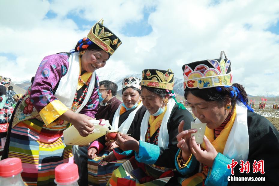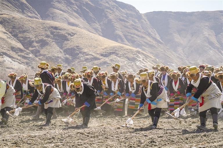 圖為拉薩市林周縣朱加村,村民穿著節(jié)日盛裝舉行傳統(tǒng)春耕儀式。林周融媒 供圖