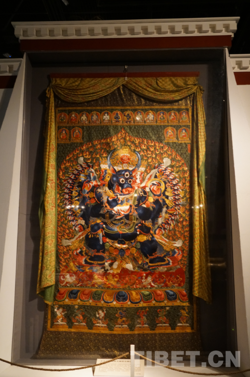 展覽專辟了一個區(qū)域展示西藏唐卡畫的發(fā)展衍生。其中,有一幅明永樂年間的刺繡大威德金剛唐卡堪稱“明星展品”。這幅高約4.3米的唐卡針線細膩,色彩鮮艷,造型生動,為密針疊線繡制手法。