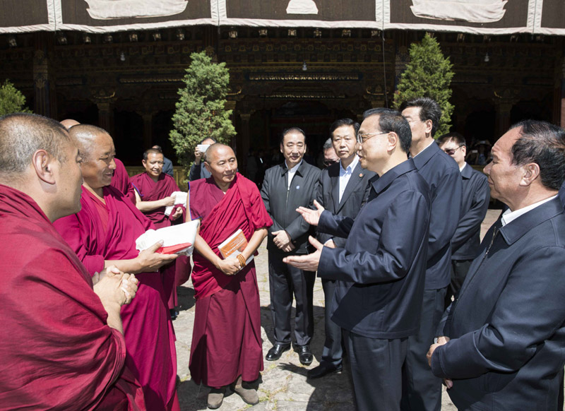 7月26日下午,李克強(qiáng)總理來到拉薩市大昭寺看望慰問西藏宗教界人士。始建于653年的大昭寺是西藏現(xiàn)存最輝煌的吐蕃時(shí)期寺廟建筑。李克強(qiáng)向西藏廣大宗教界人士致以誠摯的問候和衷心的祝福。他說,大昭寺是藏傳佛教的圣殿,同時(shí)見證了漢藏和親、民族團(tuán)結(jié)的光輝歷史。希望西藏廣大宗教界愛國人士要以歷輩高僧大德為榜樣,為維護(hù)祖國統(tǒng)一、民族團(tuán)結(jié)、社會(huì)和諧作出有益貢獻(xiàn),促進(jìn)宗教和睦、佛事和順、寺廟和諧。祝愿大家精修得道、身體健康、扎西德勒!