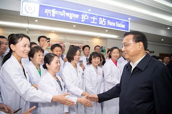 7月27日,在西藏人民醫(yī)院,李克強(qiáng)與患者、醫(yī)生護(hù)士交流。他說,西藏醫(yī)療資源難以滿足群眾需要,國家將在醫(yī)院、藏醫(yī)藥大學(xué)建設(shè)上加大支持。他勉勵(lì)醫(yī)院里的援藏人員繼續(xù)服務(wù)好西藏群眾,帶出更多當(dāng)?shù)匦枰尼t(yī)務(wù)人員。