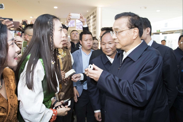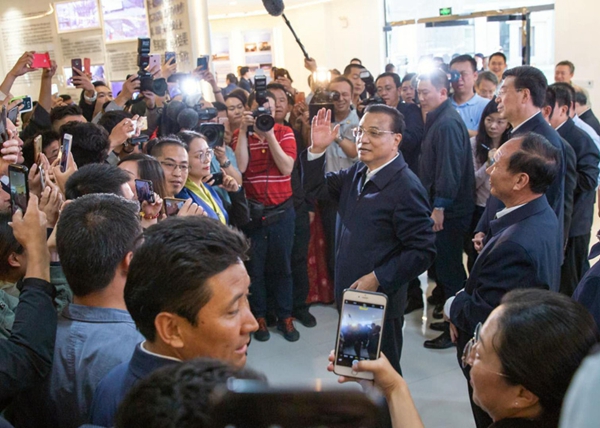 圖為李克強(qiáng)總理在拉薩柳梧高新技術(shù)開發(fā)區(qū)國家雙創(chuàng)示范基地與大家親切交談。攝影:謝圓