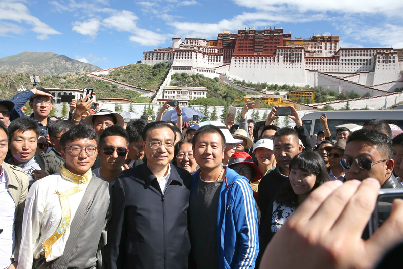 7月27日,考察布達(dá)拉宮文物保護(hù)之后,李克強(qiáng)總理來到布達(dá)拉宮廣場。看到總理到來,廣場上的市民與游客潮涌而來,爭相與總理握手。李克強(qiáng)說,從你們的笑容中和精神面貌上我能感受到這里的氣氛祥和安寧,衷心祝愿大家生活安康,扎西德勒!有游客高聲喊,“總理能不能和我們一起照張相?”李克強(qiáng)欣然應(yīng)允。市民游客們紛紛拿出各自的手機(jī),有的自拍,有的交換手機(jī)相互幫著拍,密集的拍攝聲此起彼伏。