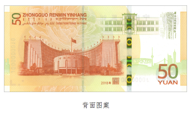 紀(jì)念鈔背面主景圖案為中國人民銀行大樓,輔以牡丹花、中國人民銀行舊址、第一套人民幣發(fā)行布告及城市建筑剪影圖案。票面左上角為面額數(shù)字“50”,中國人民銀行漢語拼音字母和蒙、藏、維、壯四種民族文字的“中國人民銀行”字樣與面額。票面下方為行長章與年號文字“2018年”。票面右下角為面額數(shù)字“50”,漢語拼音字母“YUAN”。