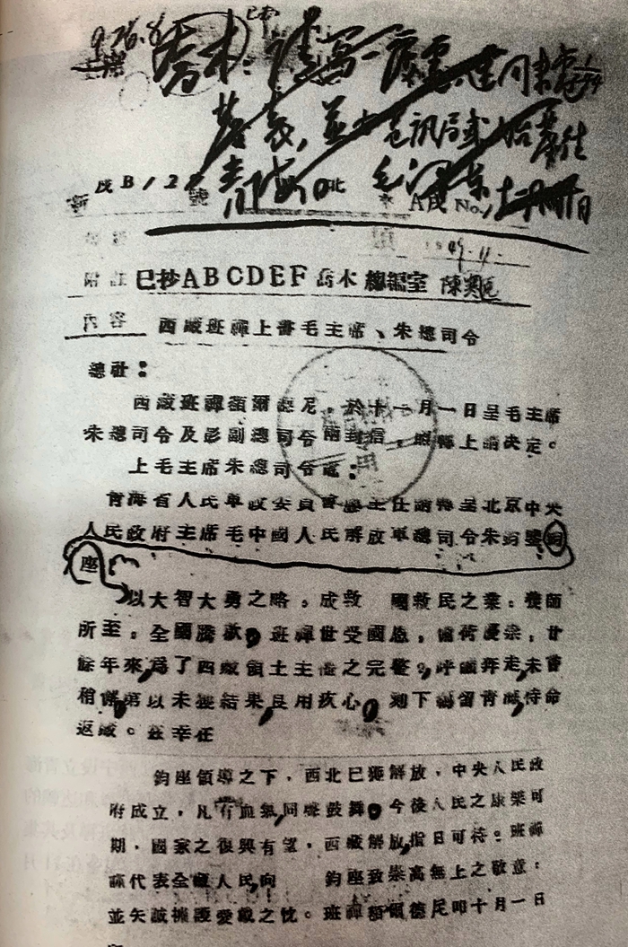 圖為1949年10月1日,十世班禪自青海致電毛主席和朱總司令,代表全藏人民要求解放西藏。(翻拍自《金鑰匙?十七條協(xié)議》)