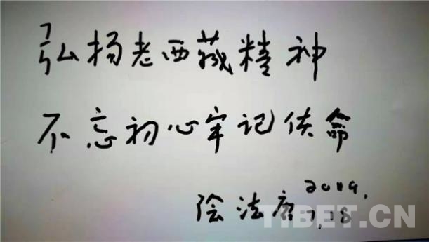 聽聞此消息,西藏自治區(qū)黨委原第一書記陰法唐欣然為該活動書寫“弘揚老西藏精神不忘初心 牢記使命”的題詞。
