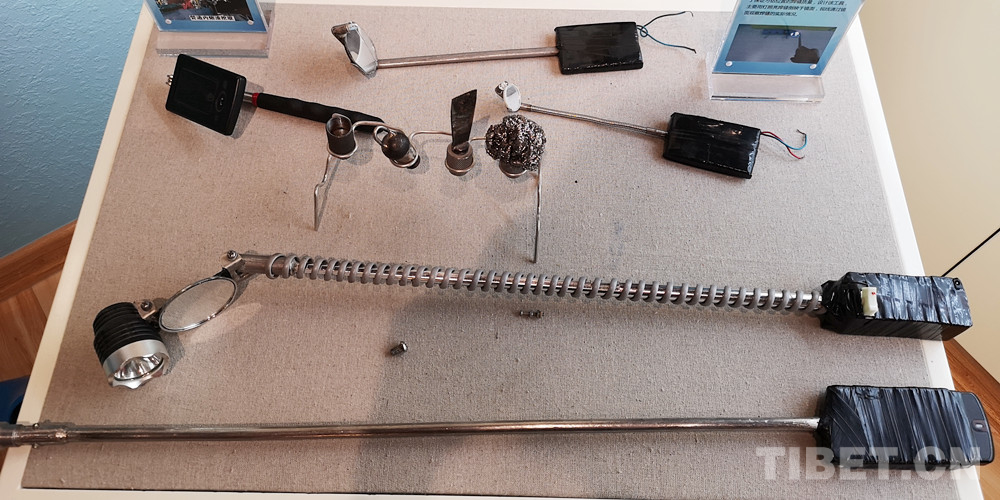 圖為楊永磊設(shè)計(jì)的管道內(nèi)熔渣挖取工具(圖上部三個)、焊縫外觀檢查工具(圖下部兩個),前者能以鏟、掃、粘或吸的方式將管道內(nèi)熔渣清理干凈,后者以燈照亮焊縫倒映于鏡面,便于觀察刁鉆位置焊縫的實(shí)際情況 攝影:李元梅