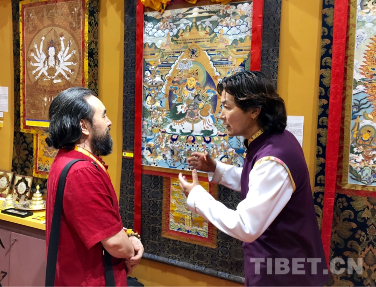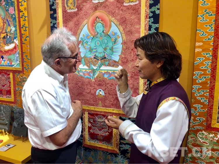 圖為國家一級作家、文化學(xué)者雪漠(左)與熱貢藝術(shù)傳承人格桑嘉措(右)在展區(qū)交流 攝影:尼知加