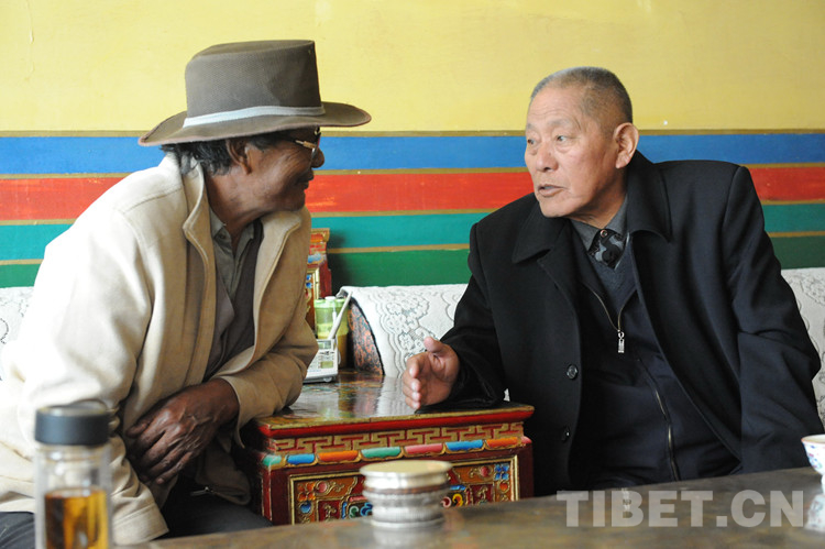 圖為當年率領申扎縣牧民群眾開發(fā)藏北無人區(qū)的傳奇英雄、原西藏人大常委會副主任洛桑丹珍(右),專程來到嘎措鄉(xiāng)白瑪家中,看望當年一同開發(fā)藏北無人區(qū)的鄉(xiāng)黨委書記白瑪(左)(2013年7月27日)攝影:唐召明