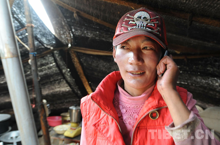 圖為嘎措鄉(xiāng)牧女頓珠卓瑪在夏季放牧點的帳篷里使用手機與家人通話報平安(2009年8月1日) 攝影:唐召明
