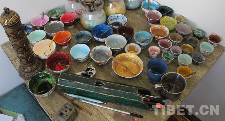 圖為繪制唐卡所用的礦物質(zhì)顏料、畫(huà)筆等工具 攝影:李元梅
