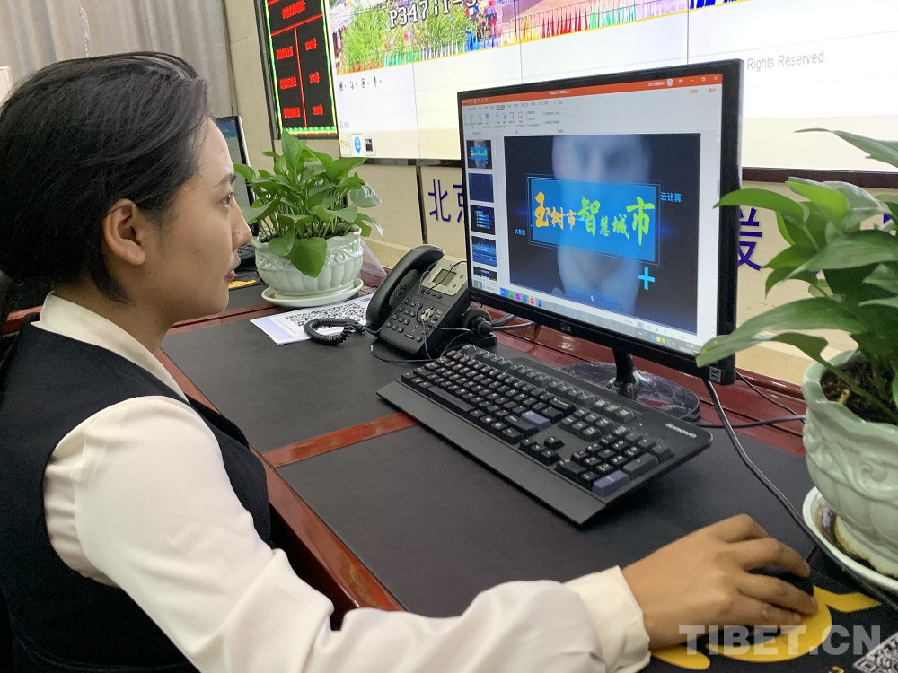 圖為工作人員向記者展示玉樹“智慧城市”有關內容