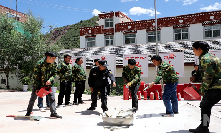 中國西藏網(wǎng)訊 “拔下保險銷,讓噴嘴對準(zhǔn)火焰根部……”46歲的尼瑪一邊講解一邊演示滅火器使用方法和注意事項,身邊幾位穿著迷彩服的學(xué)員正認(rèn)真觀察并模仿著。