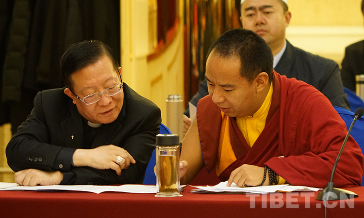 圖為2018年全國(guó)兩會(huì)期間,十一世班禪參加小組會(huì)時(shí)與中國(guó)天主教主教團(tuán)主席馬英林討論 攝影:宋家麗