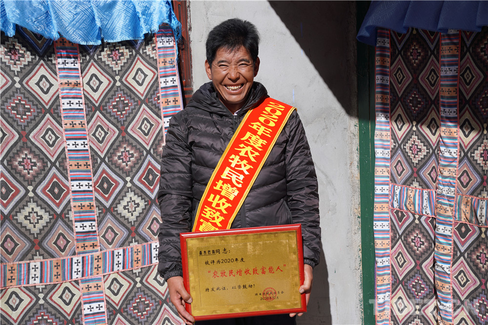 勞動致富的桑杰巴珠。他曾經(jīng)是享受國家補助的一般貧困戶。為了早日摘掉貧困帽子,自2019年開始,他先后貸款5萬元購買拖拉機,在工地上搞運輸;參加了涂裝工、抹灰工培訓班,以技術求創(chuàng)收;在拉薩、澤當承包工地人工。艱辛的努力收獲了香甜的碩果,如今的桑杰巴珠日工資最低300元;2020年帶動本村12人就業(yè),共創(chuàng)收達48萬多元。他的大女兒米瑪卓瑪于2018年考上了湖北理工學院漢語文專業(yè),小女兒拉巴曲珍考上了山南完中,曾經(jīng)的困難戶華麗轉(zhuǎn)身成為小康人家。