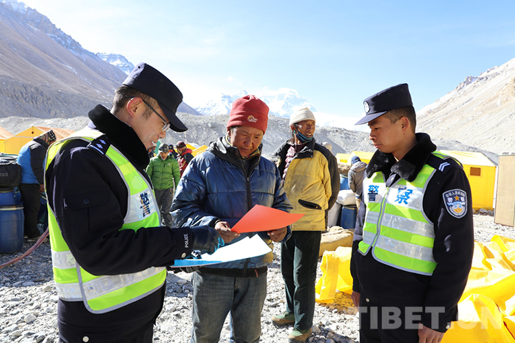 圖為在珠穆朗瑪峰大本營執(zhí)勤點,民警開展普法宣傳 攝影:鄭勁松