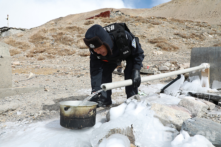 圖為執(zhí)勤點民警正在取水做飯 攝影:彭維熙