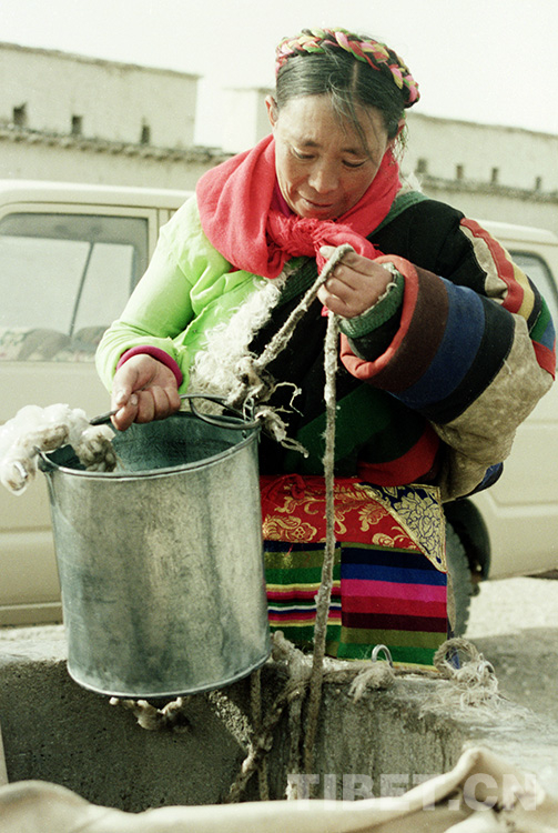 圖為文部辦事處申亞鄉(xiāng)女鄉(xiāng)長卓瑪在打井水。她當(dāng)時是全國“三八”紅旗手、那曲地區(qū)唯一的女鄉(xiāng)長(唐召明1989年12月攝)