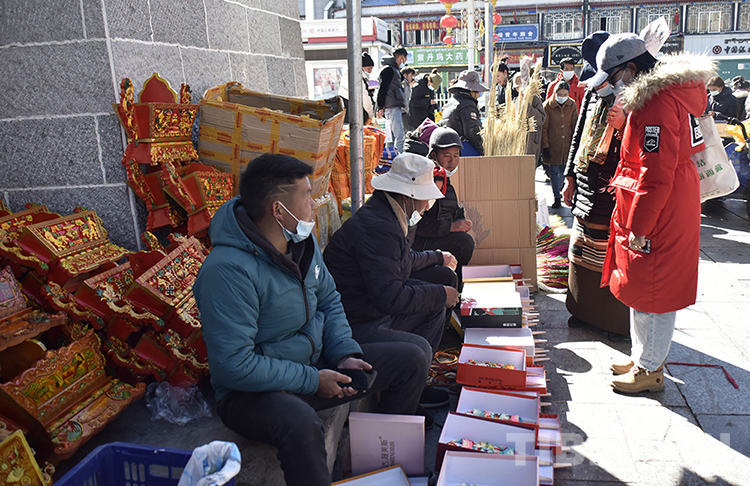 “阿佳,‘孜卓’要嗎?自己做的?!?月9日,記者在八廓商城走訪年貨市場時,遇上了來自日喀則市仁布縣普松鄉(xiāng)的頓旦和他的同伴們。四個人在八廓商城外的巷子邊擺了十多對酥油花,招攬生意。遇上過往人群多瞧一眼,他們總是耐心地揭開盛放酥油花的鞋盒蓋,期待著多賣出一對酥油花。