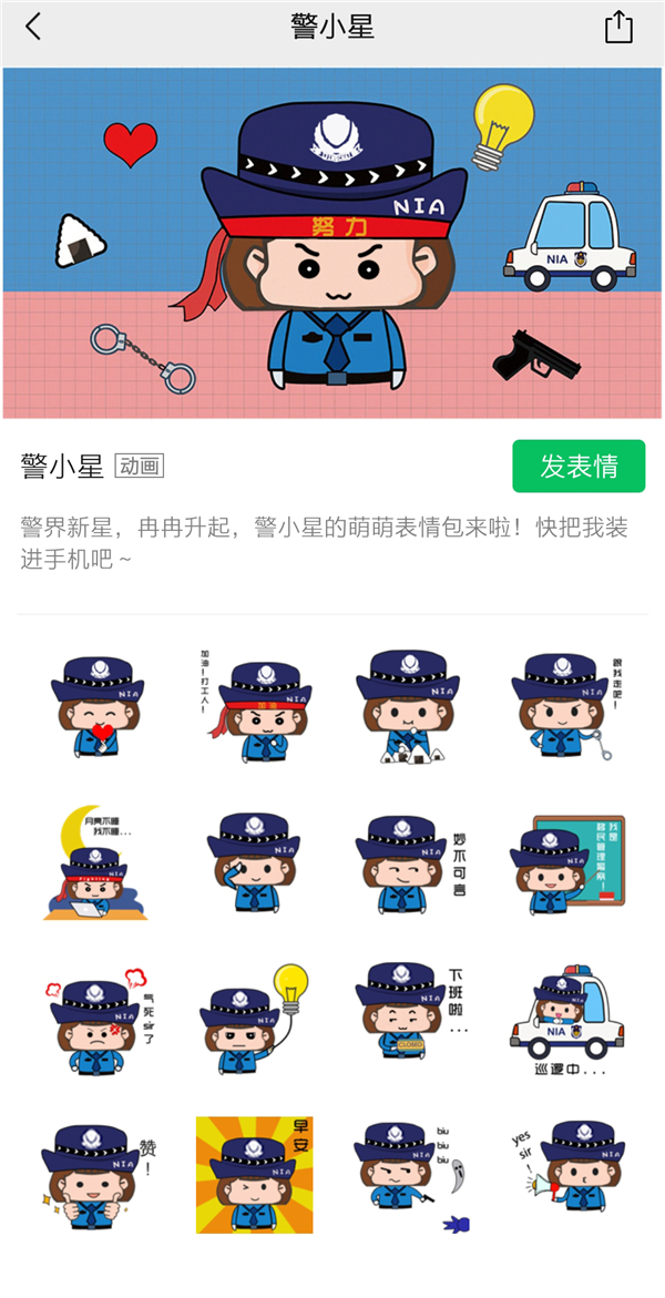 表情包中,幾筆勾勒出的卡通女民警形象憨態(tài)可掬,有著圓圓的腦袋、端正的警帽和靈動的表情,再配上簡短語句和肢體動作,模樣更加Q萌可愛,讓人倍感親切。表情包一上線就獲得了眾多點贊。