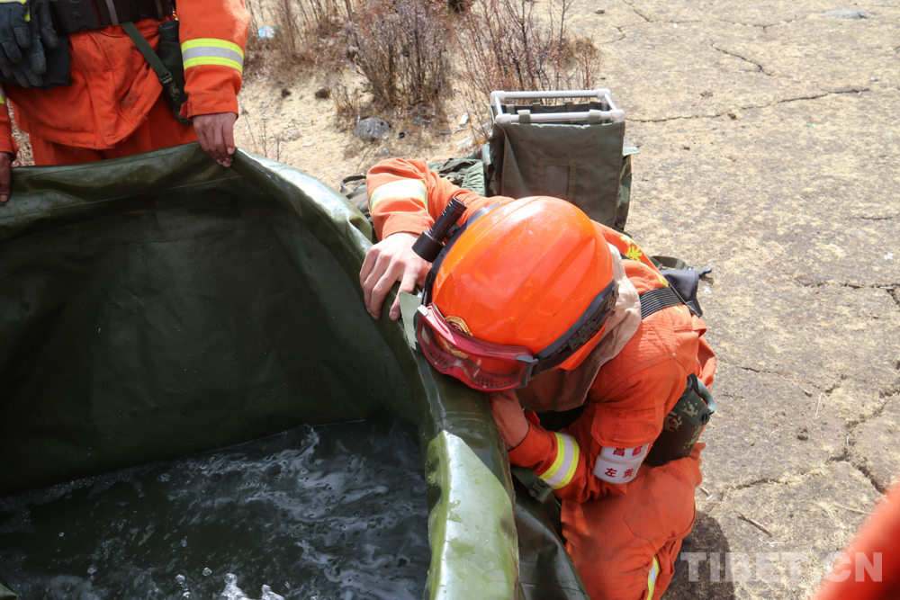 就在這時,忽然傳來一句“班長,蓄水池塌下去了”。原來是四級消防士嘎瑪珠杰發(fā)現(xiàn)水帶的水進(jìn)入蓄水池后,蓄水池并不能“站”起來,趕緊向班長蘇富康報告。
