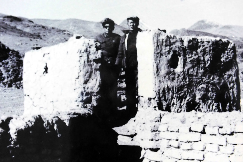 這是加林工作組公覺扎朗(左)和洛桑丹珍(右)在他們親手所建的碉堡上合影留念(唐召明翻拍資料圖片,1974年攝)