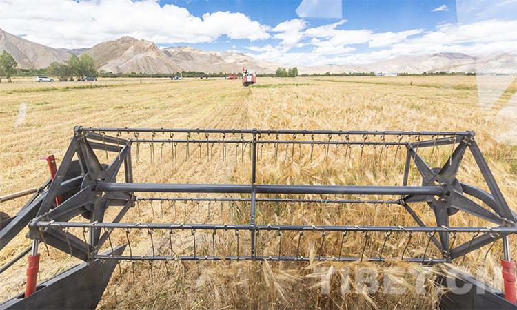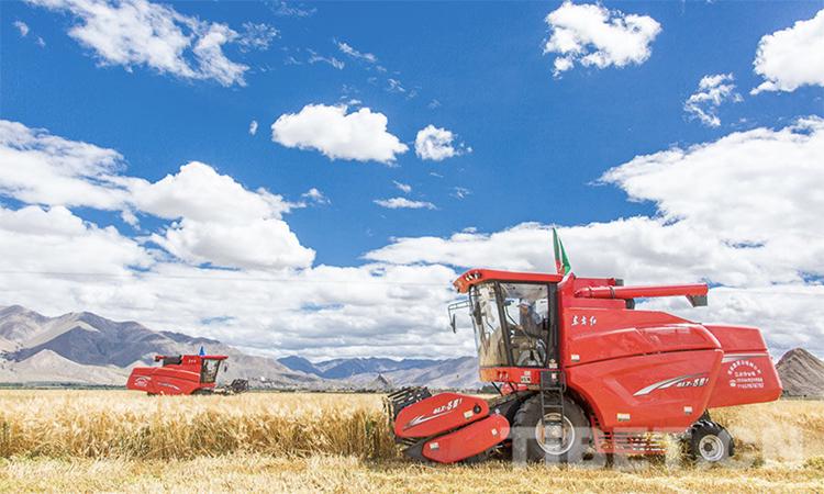 圖為日喀則市江孜縣青稞機械化收割現(xiàn)場 攝影:趙耀