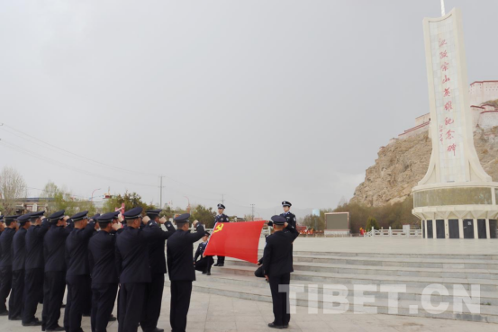 圖為康馬邊境管理大隊民警在江孜宗山英雄紀(jì)念碑前重溫入黨誓詞 楊朝祥 攝