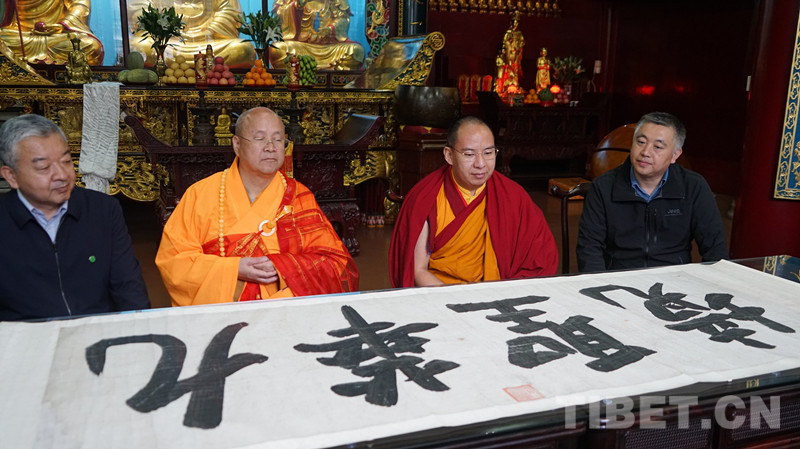 在化城寺,班禪觀賞了文物“清康熙皇帝御書'九華圣境'四字真跡”。班禪表示:“無(wú)論任何民族,都應(yīng)繼承和發(fā)揚(yáng)傳統(tǒng)中華文化,‘班禪額爾德尼’的稱號(hào)亦是康熙皇帝所賜。身為滿族人的康熙皇帝擁有著豐功偉業(yè)的一生,收復(fù)臺(tái)灣,穩(wěn)定邊陲,為祖國(guó)統(tǒng)一做出了杰出貢獻(xiàn)。所以,鑄牢中華民族共同體意識(shí),需要各個(gè)民族,各個(gè)宗教信仰始終貫徹。這件文物就是很好的歷史見(jiàn)證?!?/p>