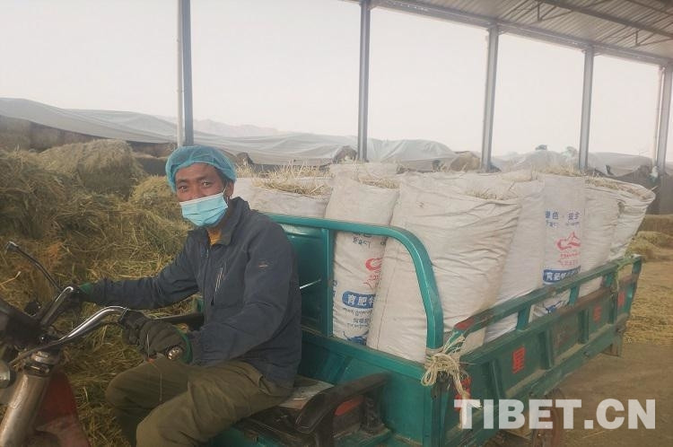 圖為崗尖村村民普布在養(yǎng)殖場(chǎng)運(yùn)送草料 圖片由受訪者提供
