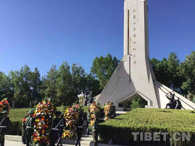 中共西藏自治區(qū)委員會、西藏自治區(qū)人大常委會、西藏自治區(qū)人民政府及各界群眾等分別敬獻的9個大型花籃一字排開,花籃紅色緞帶上書寫“革命先烈永垂不朽”8個金色大字。