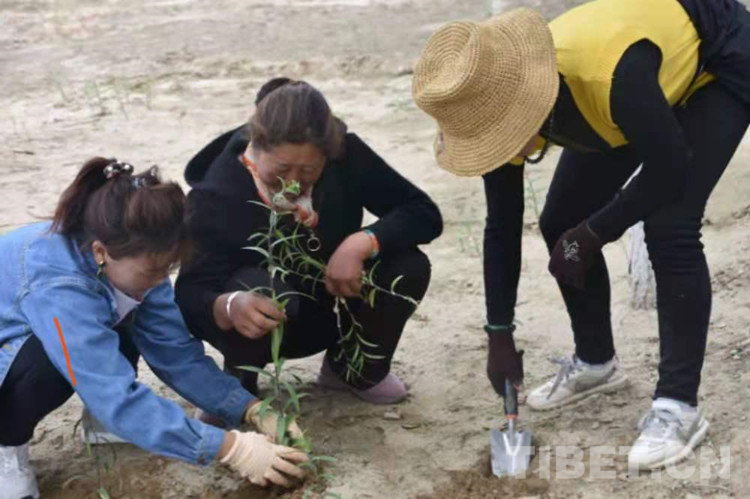圖為附近村民在藏草萬(wàn)畝植物種苗繁育基地工作 攝影:拉姆